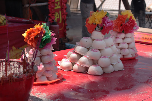 | When we got off the boats there were people putting paper into large barrels of fire and someone was setting off firecrackers. We went over to see what was going on and it appears to be a celebration with an ancestral offering. Matthew told us that while today is August 13th on the western calendar but it is July 13th on the Chinese calendar which is a day they believe ghosts come back. So paper offerings were lit on fire to send up to their ancestors and food was put out for them. |